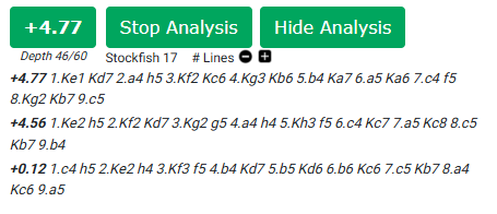 14.b5-b6+ Kc7-c6 15.a6-a7 Kc6-b7 16.c5-c6+ Kb7xc6 17.a7-a8=D+ Kc6xb6 Het is over en uit. Wit heeft een dame en de koning houdt nog steeds de 3 zwarte pionnen in een houdgreep. Stockfish geeft mat in 11 zetten aan.