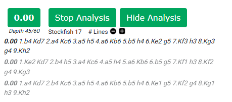 3.b2-b4 h5-h4 Hier kan zwart ook kiezen voor 3…Kd8 of 3…Kd7 die met verwisseling van zetten allemaal leiden tot dezelfde stelling.